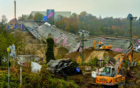 Nach erfolgter Sprengung und Sicherheitsinspektion setzten sich direkt zehn 45-Tonnen-Kettenbagger, fünf 75-Tonnen-Kettenbagger sowie drei Radlader und drei Vorderkipper in Bewegung, um die gesprengte Betonbrücke zu zerkleinern. 15.000 Tonnen Abbruchmaterial (Beton + Stahl) müssen verarbeitet werden. Rund 25 Arbeiter werden an dem Wochenende in den ersten Einsatz gehen. Insbesondere die Bereiche der Bahngleise und der Bundesstraße B 263 stehen im Fokus der ersten Maßnahmen.