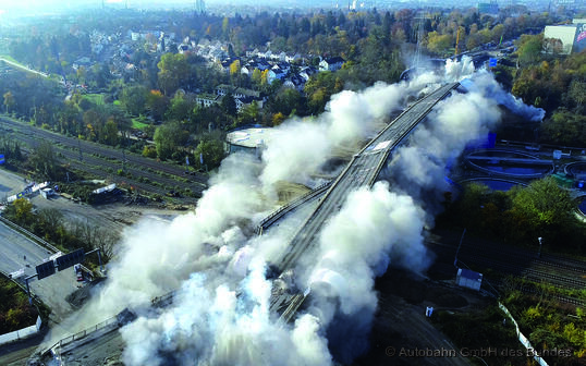 Zunächst fiel das südliche Brückenbauwerk (FR Frankfurt) senkrecht nach unten und zwei Sekunden später kippte die Nordbrücke vom Klärwerk weg auf den Südüberbau. 28 Sprengberechtigte sorgten weiterhin mit 1160 elektronischen Zündern, 1124 Bohrungen, 17 Meter Schneidladung und 15.300 m Bus / Zündleitung für die erhoffte Punktlandung.