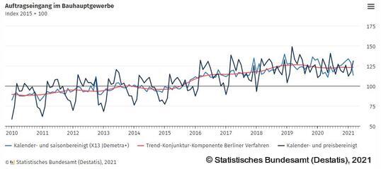 Der Auftragseingang im Bauhauptgewerbe betrug im März 2021 rund 8,1 Milliarden Euro. Das waren nominal (nicht preisbereinigt) 3,2 % mehr als im März 2020 und damit der zweithöchste jemals gemessene Wert an Neuaufträgen in einem März in Deutschland. In den ersten drei Monaten 2021 stiegen die nominalen Auftragseingänge im Vergleich zum Vorjahreszeitraum um 3,3 %.