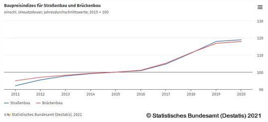 Wie das Statistische Bundesamt (Destatis) mitteilt, sind die Preise für Bauleistungen im Straßenbau in Deutschland im Jahr 2020 gegenüber 2011 um 29,1 % gestiegen. Die Erstellung von Brücken verteuerte sich im gleichen Zeitraum um rund ein Viertel (+24,1 %). Baupreisindizes spiegeln hier die Entwicklung der Preise für den Neubau von Straßen und Brücken wider. Erfragt werden hierfür die Preise repräsentativer Bauleistungen z. B. im Rahmen von Erdarbeiten, Betonarbeiten oder Oberbauschichten aus Asphalt im Verkehrswegebau.