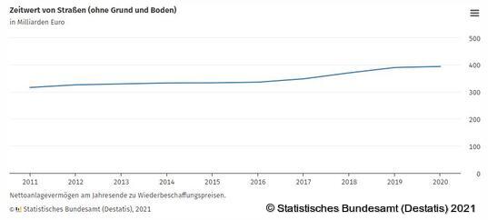 Eine gut ausgebaute Straßeninfrastruktur stellt ein erhebliches Vermögen dar. Aufgrund der gestiegenen Investitionen hat der Zeitwert der Straßen in Deutschland – ohne den Wert des zugehörigen Grund und Bodens – von 2011 bis 2020 um rund ein Viertel (24,5 %) zugenommen. Er betrug zum Jahresende 2020 rund 394,2 Milliarden Euro. Zehn Jahre zuvor waren es noch 316,5 Milliarden Euro. Den Zeitwert von Bauten wird im Rahmen der Volkswirtschaftlichen Gesamtrechnungen (VGR) nach der international empfohlenen Kumulationsmethode berechnet. Dabei wird davon ausgegangen, dass sich die heutigen Anlagegüter aus den Investitionen der Vergangenheit zusammensetzen.