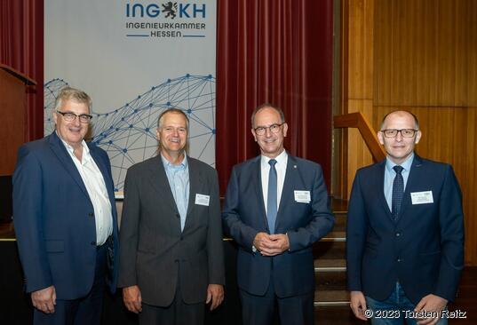 Auf dem Bild zu sehen sind (von links nach rechts): Dipl.-Ing. Ingolf Kluge (Präsident der Ingenieurkammer Hessen), Dr. rer. nat. Ronald Steinhoff (Vorstandsmitglied der Ingenieurkammer Hessen), Dr. Christoph Ullrich (Regierungspräsident, Regierungspräsidium Gießen) und Dipl.-Ing. (FH) Peter Starfinger (Geschäftsführer der Ingenieurkammer Hessen) beim Fachplanertag Energieeffizienz und Erneuerbare Energien IngKH in der Kongresshalle Gießen am 5. September 2023.
