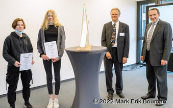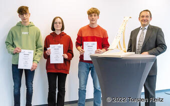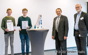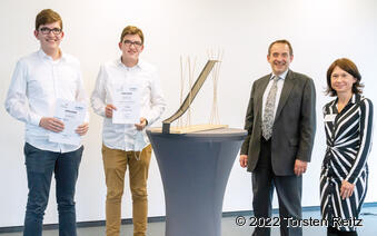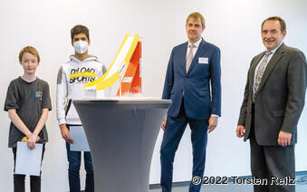 Daniel und Sebastian Böning aus der 10. Klasse der Dietrich-Bonhoeffer-Schule erhielten für ihr Modell „Sheeshanze“ die Auszeichnung für den dritten Platz in der Alterskategorie II aus den Händen des Hessischen Kultusministers Prof. Dr. R. Alexander Lorz und von Dipl.-Kffr. Bettina Bischof (Referatsleiterin Personal, Finanzen und Organisation bei der Ingenieurkammer Hessen, v.l.).