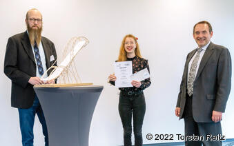 Strahlende Gesichter gab es nicht nur bei Nina Braun aus der 12. Klasse der Eugen-Kaiser-Schule in Hanau (Mitte), die mit ihrem Modell „Die Kobra“ auf dem zweiten Platz in der Alterskategorie II landete, sondern auch beim Hessischen Kultusminister Prof. Dr. R. Alexander Lorz (rechts) und Juror Dipl.-Ing. Kai Kühne (Ingenieurbüro Unverzagt, links), die ihr die Auszeichnung überreichen.